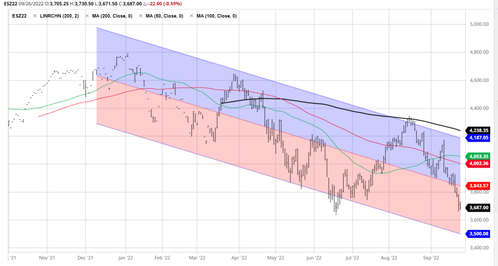 S&P 500 reached the June 16th low point on Friday 23rd, but managed to close just above the bear market lows. The move was partially driven by the disturbances in the currency markets, and still higher short term interest rates. However, it appears that the peak in the Fed hawkishness has been reached, or we are very close to the peak. Thus, I am expecting a bounce from the oversold levels.